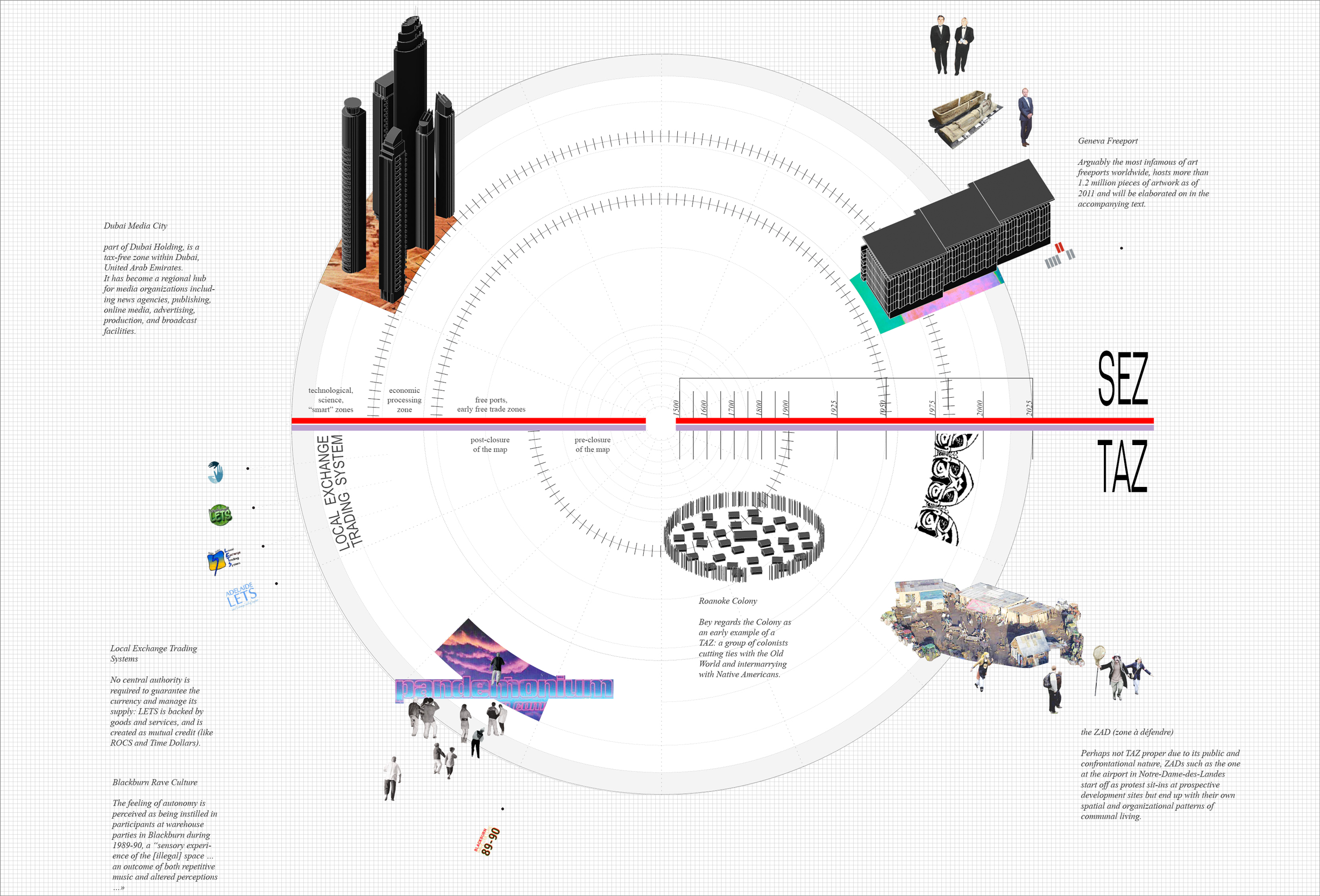 In this section I will attempt to explore the intersections of two concepts that lead to radical spatial and urban arrangements: the Special Economic Zone, as theorized by urbanist Keller Easterling in her book, Extrastatecraft (2014) and the Temporary Autonomous Zone introduced by anarchist writer Peter Lamborn Wilson, known as Hakim Bey, in 1991. The latter belongs to a strand of post-anarchism called ontological anarchism which advocates for temporary and autonomous communities in the present reality that maintain a distance from the state, “that pustulant giant who sleeps.” [1] This call to action embraces the precarity inherent to aspirations of autonomy under the capitalist state, and maintains that communities must be designed as temporary in order to disassemble when necessary and elude confrontation. In the original text, Hakim Bey handpicks historical examples which he believes qualify as TAZs, ranging from rogue 16th-century settler colonies in the North America to short-lived 20th century free states. The term was later applied by its enthusiasts to various horizontal communities with varying degrees of autonomy that bypass the state and its formal structures such as the free Blackburn raves of 1990-1991 [2] and contemporary Local Exchange Trading Systems (LETS). [3]